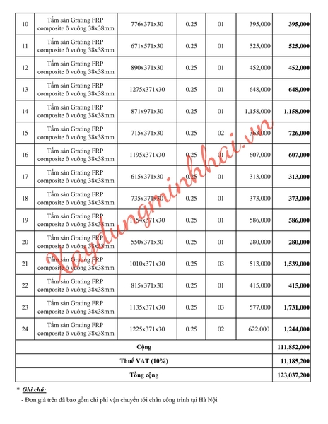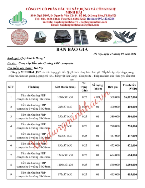 Dưới đây là bản báo giá tấm sàn composite grating với khá nhiều kích thước khác nhau mà Minh Hải đã báo và ký kết hợp đồng hợp tác với một đơn vị đối tác tại Hà Nội.