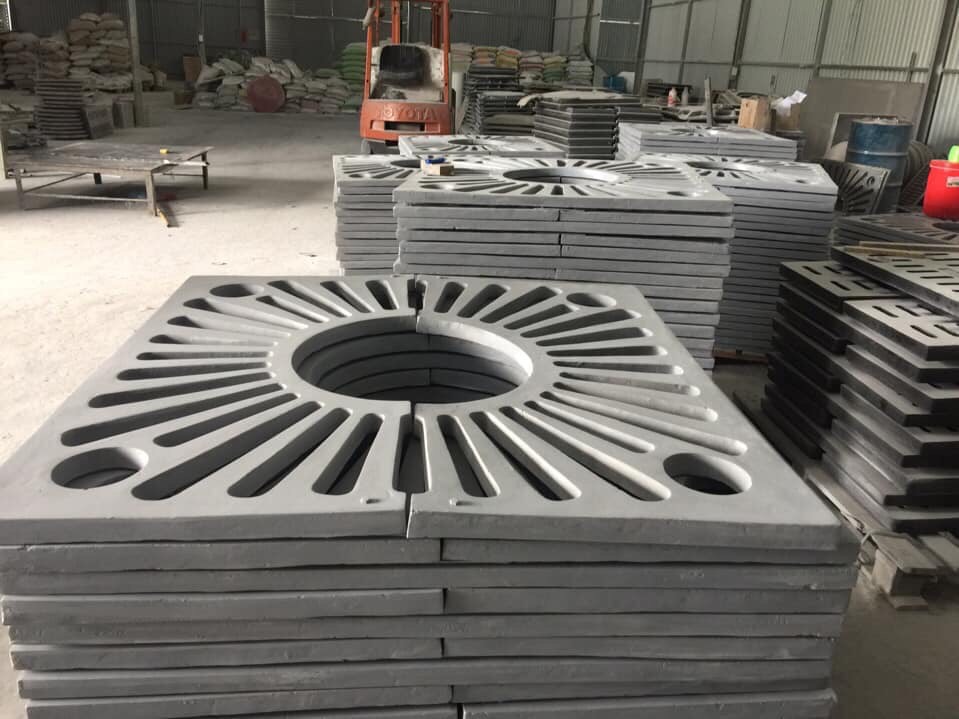 Tấm bảo vệ gốc cây từ chất liệu gang thiết kế 2 loại là gang cầu và gang xám. Gang cầu kích thước chắn chắn hơn gang xám, giá thành sản phẩm cao hơn. Sản phẩm có kích thước khá nặng, lắp đặt khó khăn hơn những loại chất liệu khác.