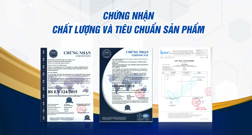 - Các sản phẩm của công ty Minh Hải được kiểm tra đánh giá chất lượng và được cấp chứng nhận phù hợp với tiêu chuẩn châu Âu BS EN 124:2015 và được phép sử dụng dấu chất lượng Việt Nam: TCVN ISO 9001:2015