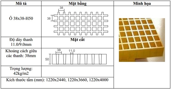 Đối với sản phẩm tấm sàn FRP composite có rất nhiều thông số kích thước và quy cách. Tuy nhiên hiện nay tấm sàn được sử dụng thông dụng nhất là các thông số dưới đây.